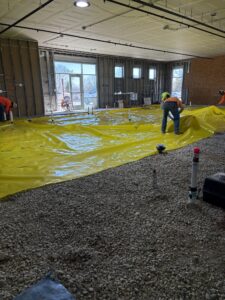 The Home Sweet Home project is underway.  Job superintendent Dan Connelly and crews have been busy, completing the underslab plumbing and inspections so the new concrete floors could be completed. Upon completion of the floors, the CMU (concrete masonry unit) walls were put in place.  The mechanical HVAC units are being hung overhead while the electrical, plumbing and fire suppression systems are underway.  Metal wall framing will begin soon.